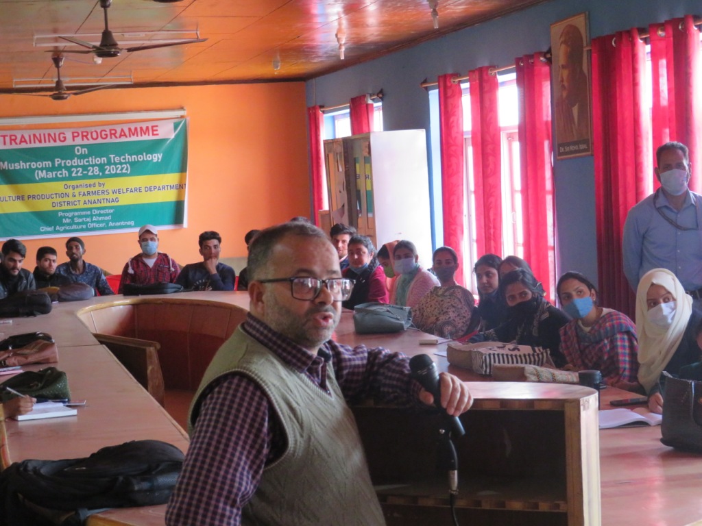 ANANTNAG: Department of Agriculture Production and Farmer Welfare Kashmir today organized a week long training programme on Mushroom Production Technology at Govt. Boys higher secondary school Barakpora, Anantnag. The training programme is attended by newly recruited employees under PM Package for Kashmiri Migrants & Non Migrant Kashmiri Pandits of the Department.