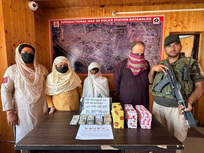 Srinagar Police in a Tweet, said during the investigation of FIR 49/2023 & 101/2023 of Batmaloo Police Station, 3  accused identified as Ishfaq Ahmad Dewa of Palpora Noorbagh,  Fatima @ Buri of Friestabal Pampore and Asia Rasool of Hari Singh High street were arrested. Stolen material i.e 4 gold rings, 3 gold chains, worth approximately ₹ 2,60,000 were also recovered.