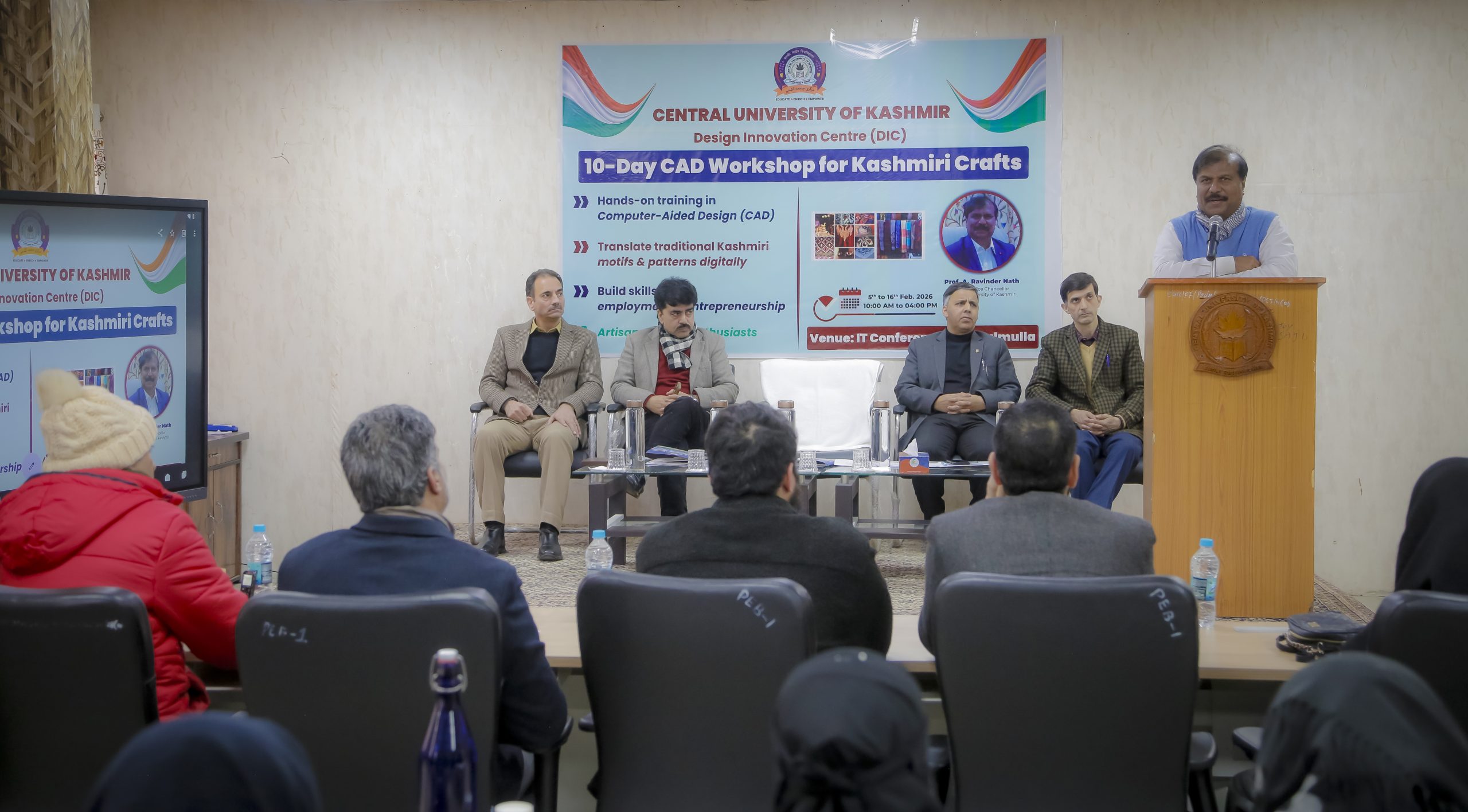 Inaugurating the workshop, Vice-Chancellor, Prof. A. Ravinder Nath, described the event as a wonderful initiative to safeguard Kashmir’s cultural identity while strengthening livelihoods. Emphasising Kashmir’s global reputation as a seat of knowledge and craftsmanship, the Vice-Chancellor noted that sustaining handicrafts is not merely an economic necessity but a cultural imperative. “Crafts are identity. To keep them alive, we must understand markets, consumer psychology, cultural symbolism and design aesthetics. Technology helps sharpen creativity while minimising physical effort,” he said, adding that future-ready artisans must be conversant with emerging tools such as automation, digital design and artificial intelligence.