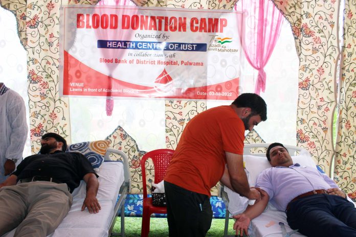 AWANTIPORA: A Blood Donation Camp was organized by Islamic University of Science and Technology in association with Blood Bank of District Hospital, Pulwama today on August 3, 2022. The