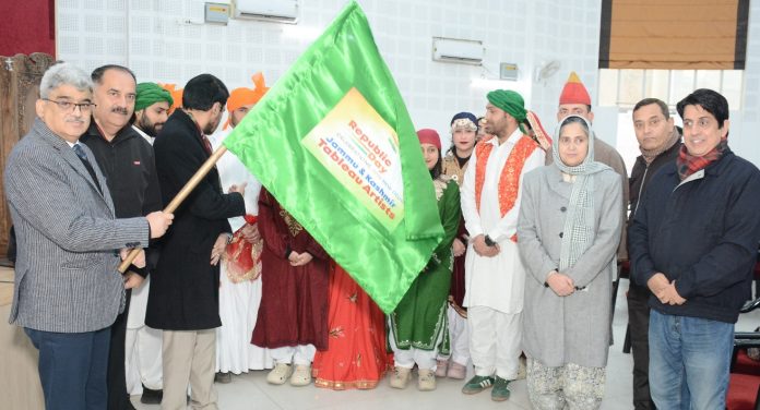 JAMMU: Chief Secretary, Jammu & Kashmir, Atal Dulloo today flagged off the contingent of artists of the Jammu & Kashmir Tableau who will perform at Kartavya Path, New Delhi, during the Republic Day Parade–2026. The artists will be part of the J&K Tableau representing the Union Territory on the national stage. The flag-off ceremony was held today at K. L. Saigal Hall, Jammu.