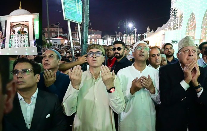 SRINAGAR: Chief Minister Omar Abdullah today joined the devotees at the revered Hazratbal Shrine here on the auspicious occasion of Eid-e-Milad-un-Nabi (SAW). The Chief Minister offered Magrib Namaz (evening prayers) at the shrine, which houses the sacred Moy-e-Muqaddas (Holy Relic of Prophet Muhammad, PBUH). After the prayers, he was blessed with a glimpse of the Holy Relic, along-with the congregation of devotees.