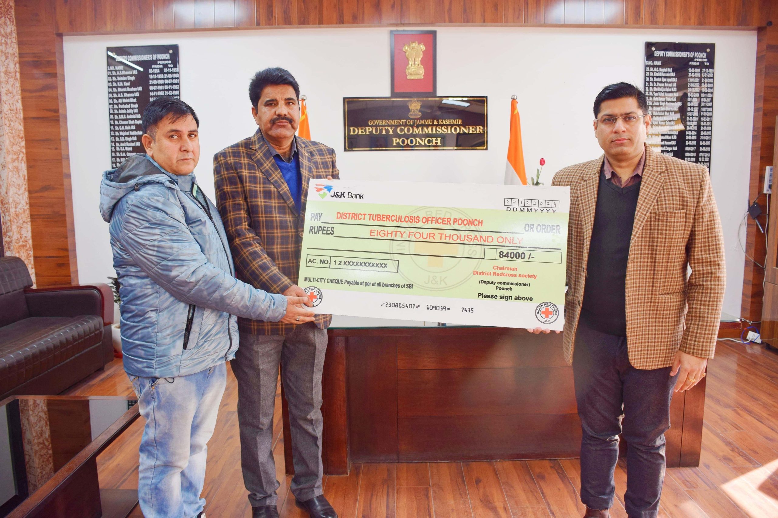 POONCH: A cheque amounting to Rs. 84,000 has been issued by the Chairman of the District Red Cross Society (Deputy Commissioner), Vikas Kundal to the Chief Medical Officer, Dr. P.A. Khan. The funds will be allocated among 28 tuberculosis (TB) patients under the Pradhan Mantri TB Mukt Bharat Abhiyan (PMTBMBA) program.