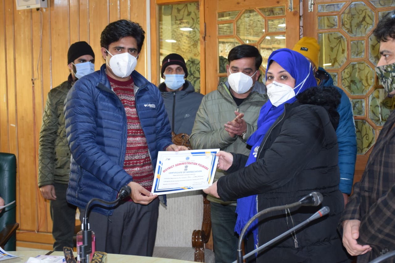 PULWAMA: The Deputy Commissioner (DC) Pulwama, Baseer-ul-Haq Choudhary felicitated the doctors, besides health, Anganwadi and Aasha workers of the district who are on the frontline of the fight against the Covid-19 pandemic at district administrative complex, here.
