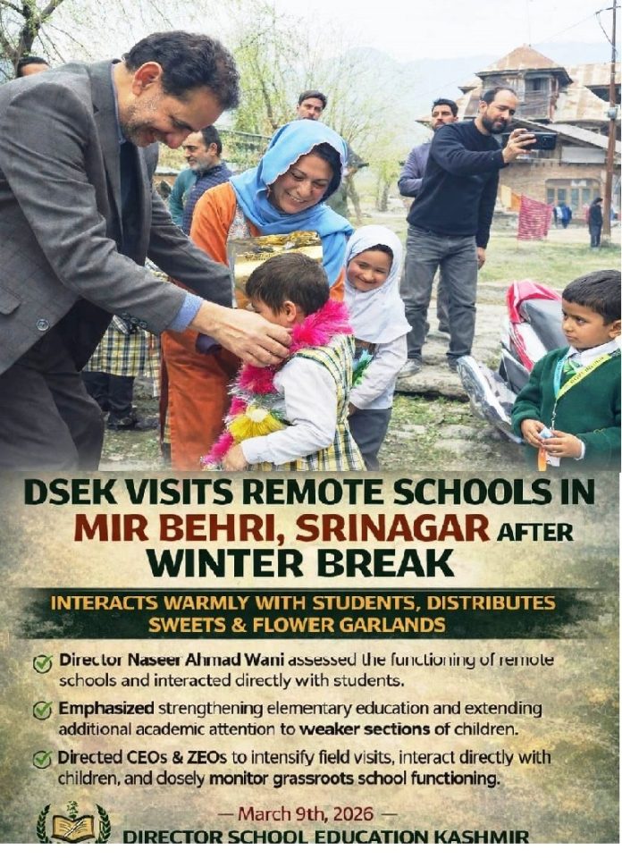 He further directed Chief Education Officers (CEOs), Zonal Education Officers (ZEOs) and Cluster Heads across the Kashmir Division to undertake regular field visits, interact with students and teachers and closely monitor the academic functioning of schools in their respective jurisdictions to ensure quality education at the grassroots level.