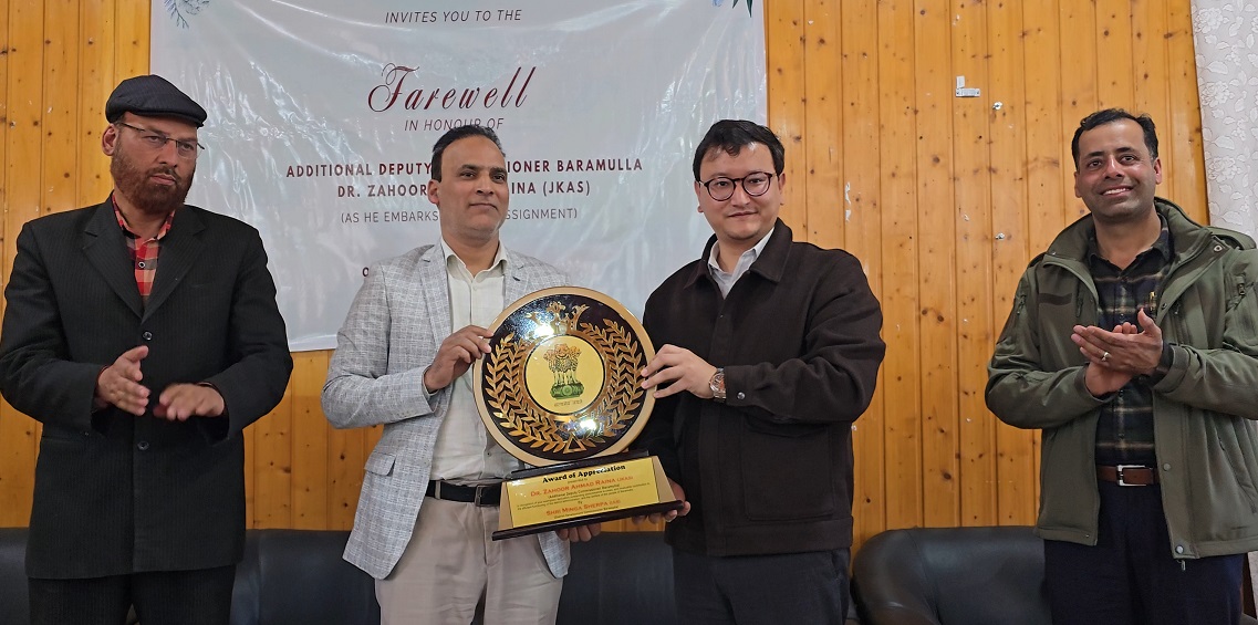 BARAMULLA: The District Administration Baramulla organized a farewell function at Dak Bungalow Baramulla to honor the outgoing Additional Deputy Commissioner (ADC), Dr. Zahoor Ahmad Raina and to welcome the newly appointed ADC, Syed Altaf Hussain Musvi, and Sub-Divisional Magistrate (SDM) Gulmarg, Mir Jaliel Ahmed.