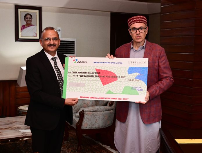 SRINAGAR: In a gesture of solidarity and compassion, the High Court today handed over a cheque of Rs. 54,40,500/- to the Chief Minister’s Relief Fund (CMRF) for the rehabilitation and welfare of those who have suffered due to recent devastating floods in the region.