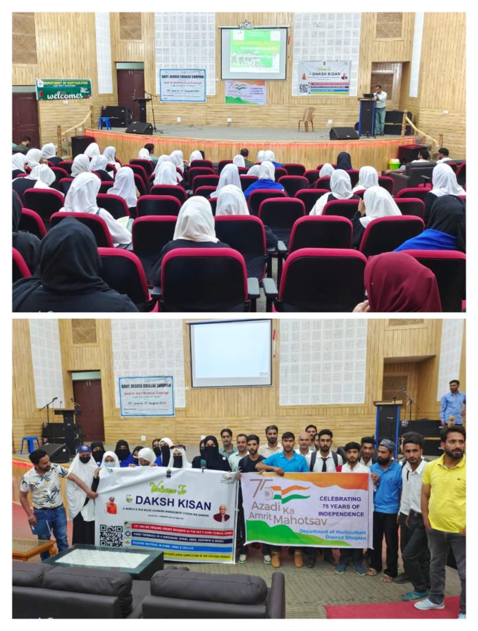 SHOPIAN: With its continuous efforts to generate awareness of DAKSH KISAN under Holistic Agriculture Development Programme (HADP) among the educated youth, Chief Horticulture Officer Shopian – who is also District Nodal Officer (DNO) ‘Kissan Sampark Abhiyan’ District Shopian today organised awareness camp regarding Daksh Kissan at Imtiyaz Memorial Government Degree College (IM-GDC) Shopian.