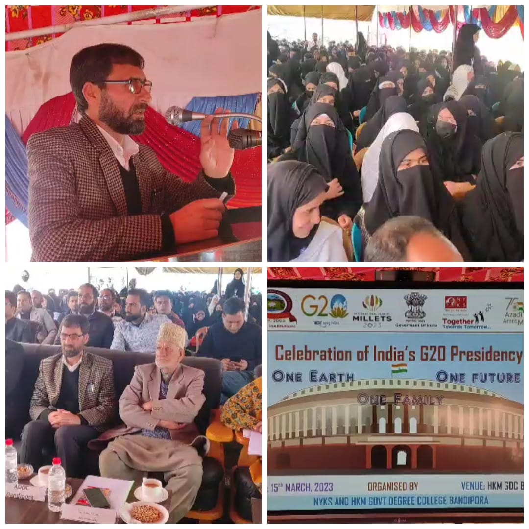 District Development Council (DDC) Chairperson Abdul Gani Bhat, DDC Vice Chairperson Kounser Shafeeq, Principal HKM Degree College Patushay Bandipora, and Deputy Director (KYKB) attended the District Neighborhood Youth Parliament celebration of India’s G20 Presidency.