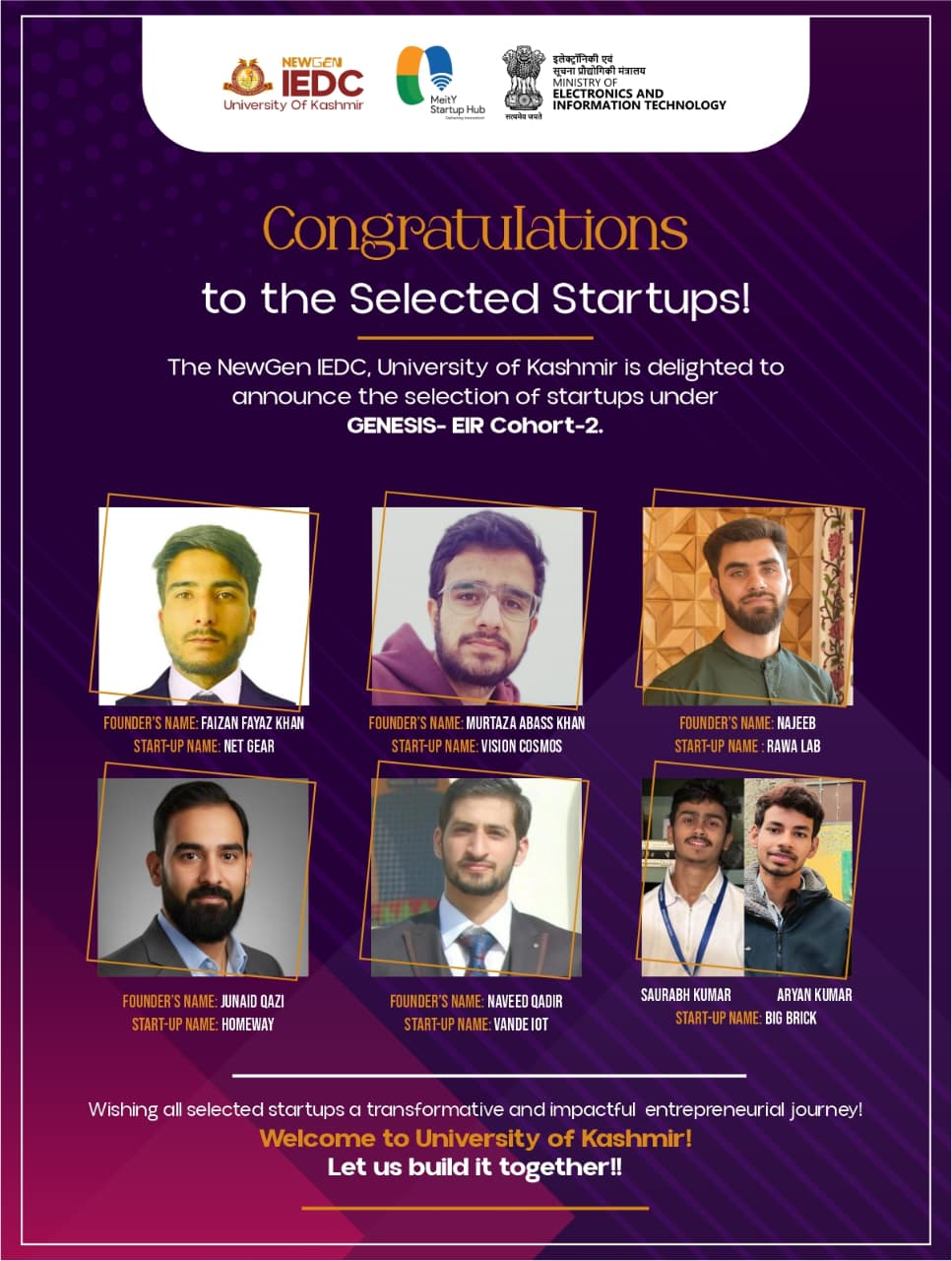 SRINAGAR: The University of Kashmir (KU) has selected six innovative startups for the MeitY GENESIS—Entrepreneur-in-Residence (EIR) Cohort-2 funding support. The selected startups include Net Gear (Faizan Fayaz Khan), Vision Cosmos (Murtaza Abbas Khan), Rawa Lab (Najeeb), Homeway (Junaid Qazi), Vande IOT (Naveed Qadir), and Big Brick (Saurabh Kumar and Aryan Kumar).
