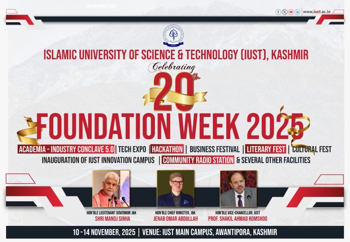 AWANTIPORA: The Islamic University of Science and Technology (IUST), will celebrate its 20th Foundation Day with a series of academic, entrepreneurial, innovation-driven, cultural, and community-focused events from November 10 to 14, 2025. The celebrations highlight the University’s remarkable journey of academic growth, innovation, societal service and national recognition since its foundation.