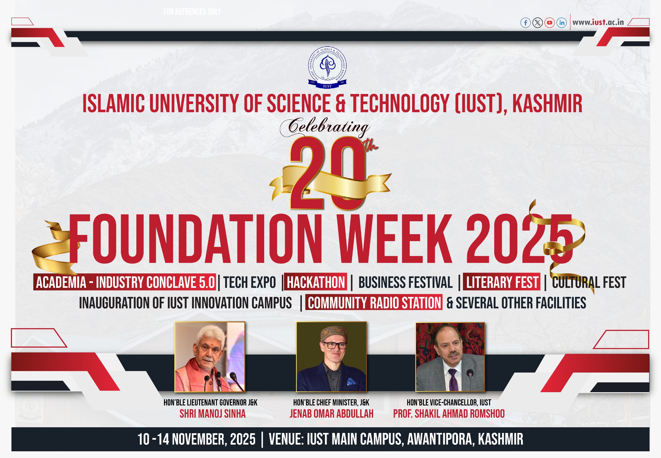The inaugural ceremony on November 10 will be graced by Jenab Omar Abdullah, Chief Minister of Jammu & Kashmir, as Chief Guest. On November 12, Manoj Sinha, Lieutenant Governor of Jammu & Kashmir and Chancellor of IUST, will preside as Chief Guest at a special Foundation Day event and will, among other engagements, inaugurate the newly established IUST innovation Campus and University’s main administrative block.
