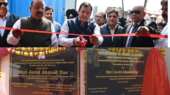 SAMBA: In a significant push to strengthen the livestock and agriculture sectors, Minister for Agriculture Production, Rural Development and Panchayati Raj, Cooperative and Election Department, Javid Ahmad Dar, on Tuesday inaugurated the modernised Cattle Feed Plant at Bari Brahmana and the newly developed Wool Trade Mandi at Kartholi in Samba district.