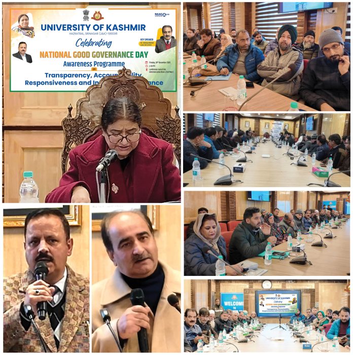 SRINAGAR: On the eve of National Good Governance Day, the University of Kashmir organised an awareness programme on the theme “Transparency, Accountability, Responsiveness and Inclusive Governance” with an aim to sensitise the university fraternity about the core principles that underpin effective and people-centric governance.