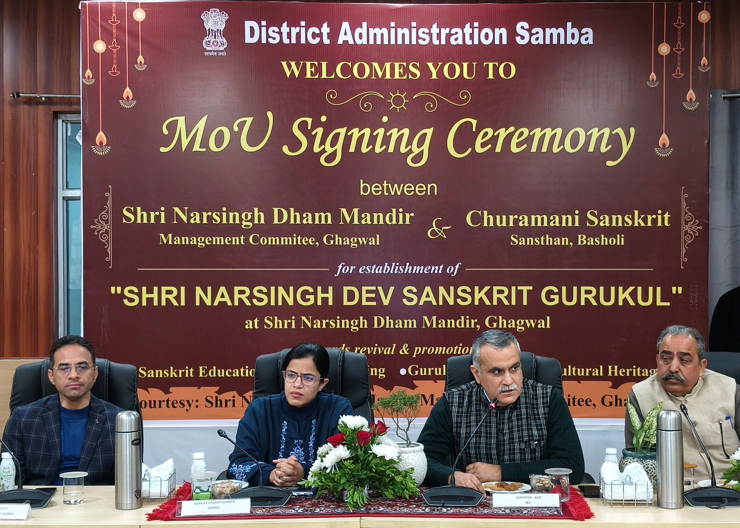 SAMBA: In a landmark initiative to revive India’s ancient Gurukul tradition and preserve the region’s rich cultural heritage, a Memorandum of Understanding was signed today between the Shri Narsingh Dham Mandir Management Committee, Ghagwal and Churamani Sanskrit Sansthan, Basohli for the establishment of “Shri Narsingh Dev Sanskrit Gurukul” within the premises of historic temple.