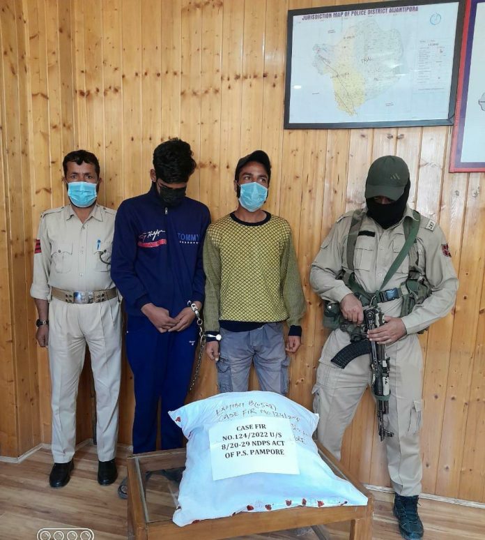 Acting on information, a police party of Police Station Pampore headed by SHO PS Pampore under the supervision of SDPO Pampore Imtiyaz Ahmad-JKPS at a special checkpoint established at Tulbagh Crossing arrested 02 drug peddlers. They have been identified as Amir Hamid Lone son of Abdul Hamid Lone resident of Lalwani Mohalla Drangbal and Imran Baktoo son of Mohd Ibrahim Baktoo resident of Noorani Colony Pampore. During search, 5.5Kgs of grinded Cannabis was recovered from their possession. They have been shifted to police station where they remain in custody.