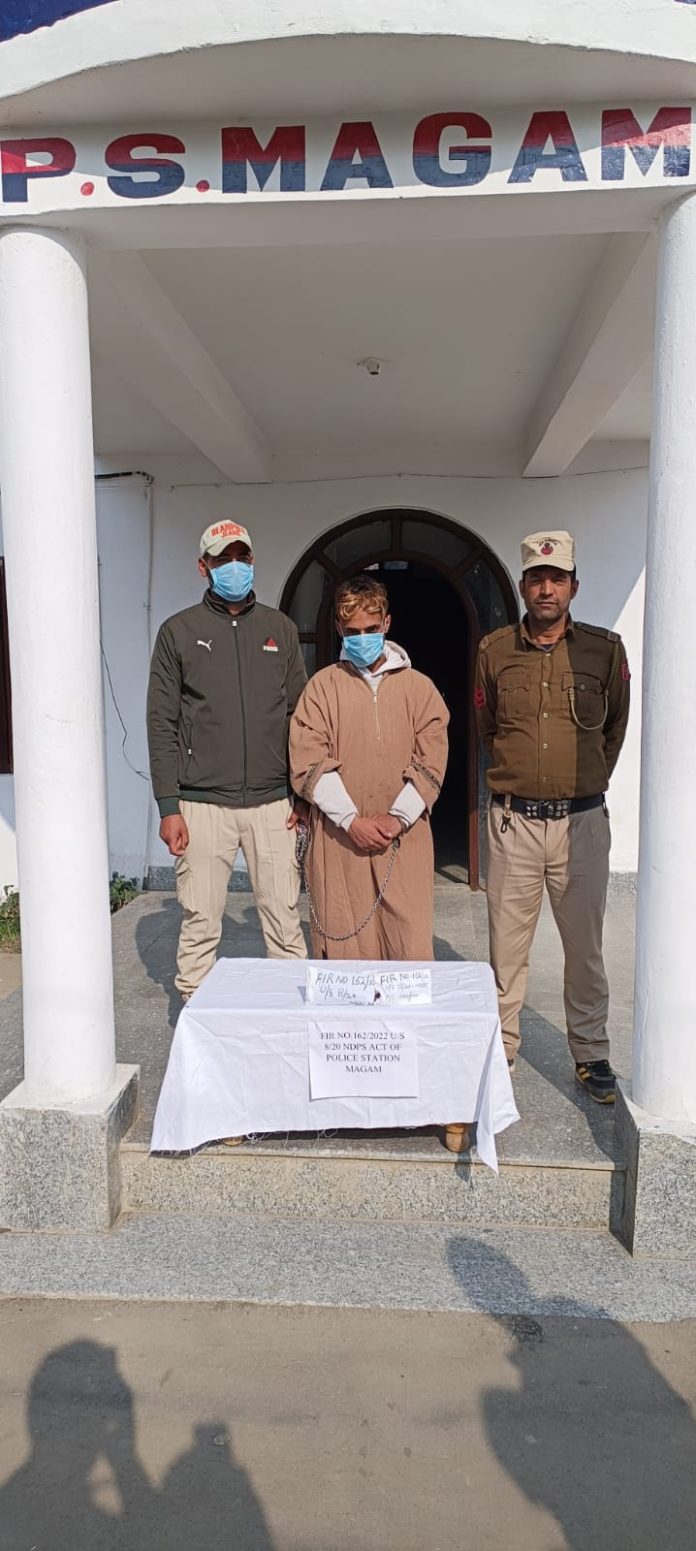 A police party of Police Station Magam during patrolling at Peth Kanihama intercepted a person moving in a suspicious circumstance who tried to flee from the spot but was apprehended tactfully by alert police party. During search, 105 grams of charas like substance was recovered from his possession. He has been identified as Faisal Hamid Bhat son of Ab Hamid Bhat resident of Peth Kanihama Magam. He has been arrested and shifted to police station where he remains in custody.