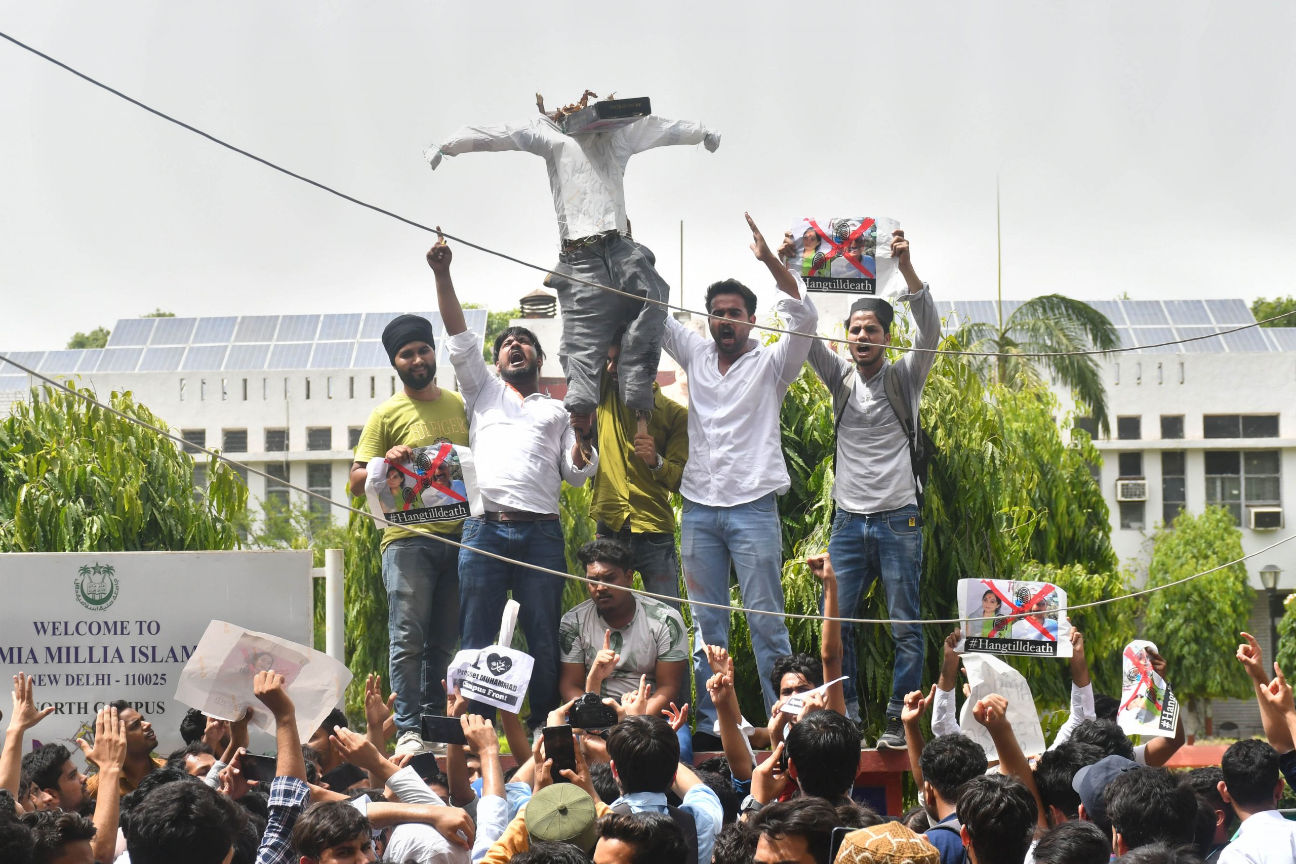 A large number of people could be seen gathering at the steps of the famous mosque, some carrying placards and shouting slogans against Sharma.
