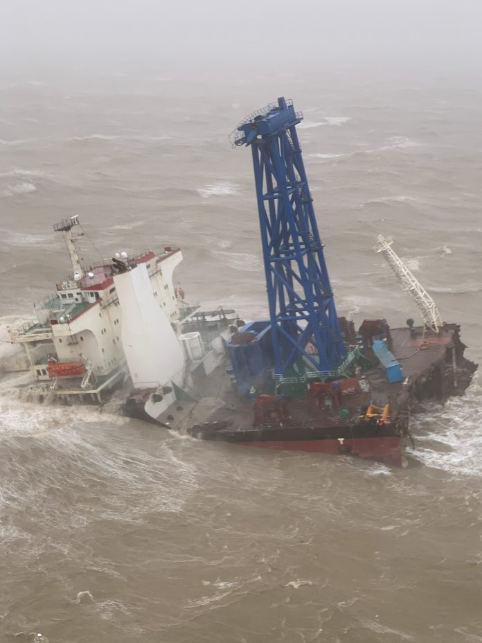 Photos released by the Hong Kong Government Flying Service showed one crew member being winched up to a rescue helicopter as big waves lashed the sinking vessels, which had broken up in two parts.