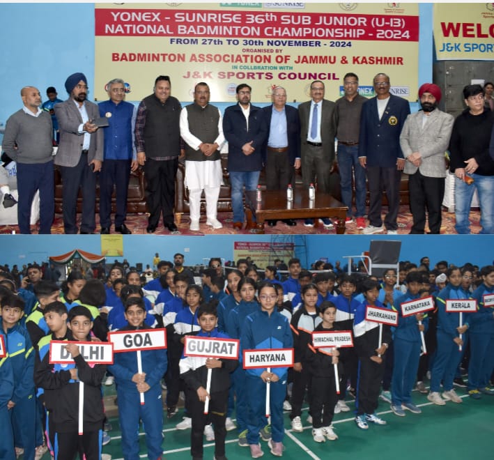 JAMMU: Minister for Youth Services & Sports, Science & Technology, FCS&CA, Transport, IT, ARI & Training, Satish Sharma, today declared open the “Yonex- Sunrise 36th Sub Junior (U-13) National Badminton Championship-2024” at the Indoor Sports Complex, M A stadium in Jammu.